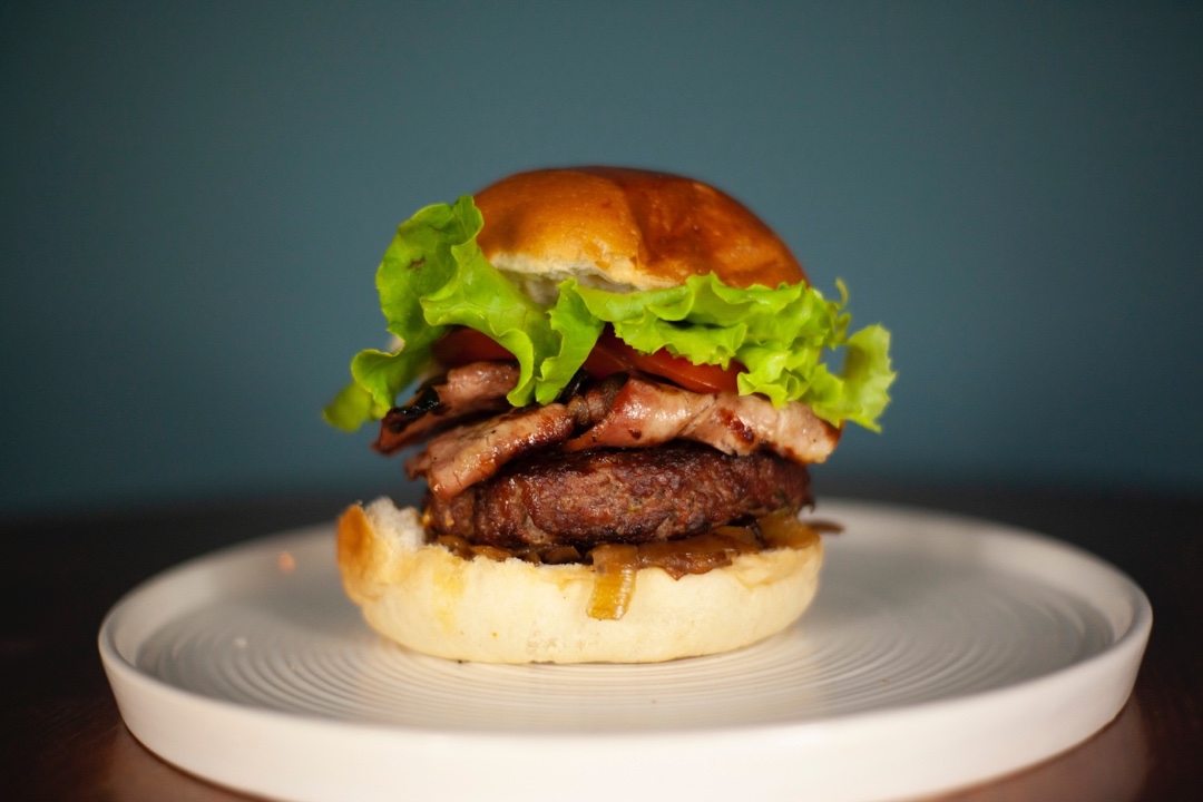 burger di manzo, bacon, pomodoro, insalata, cipolla